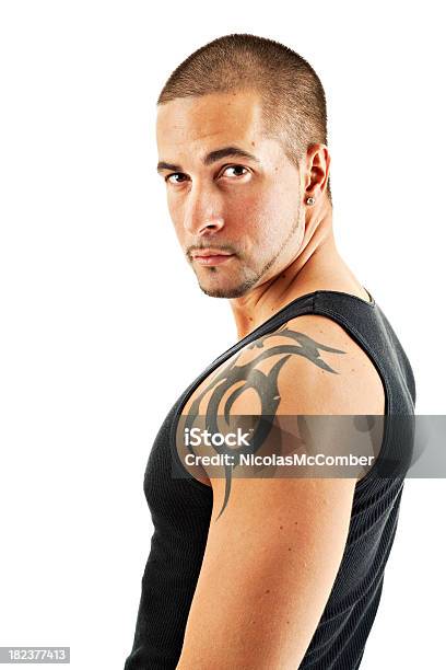 Tattooed Young Man Looking Over His Shoulder Stock Photo